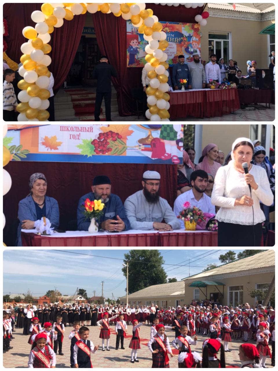 На торжественной линейке присутствовали гости: кадий района Хайдарханов А.М., главы администрации Верхне-Наурского сельского поселения Лечиев Х.М., специалист по спорту и туризму Администрации Надтеречного Муниципального района Керимов Идрис Исраилович., ведущий специалист Надтеречного РУО Гайрханова З.С.