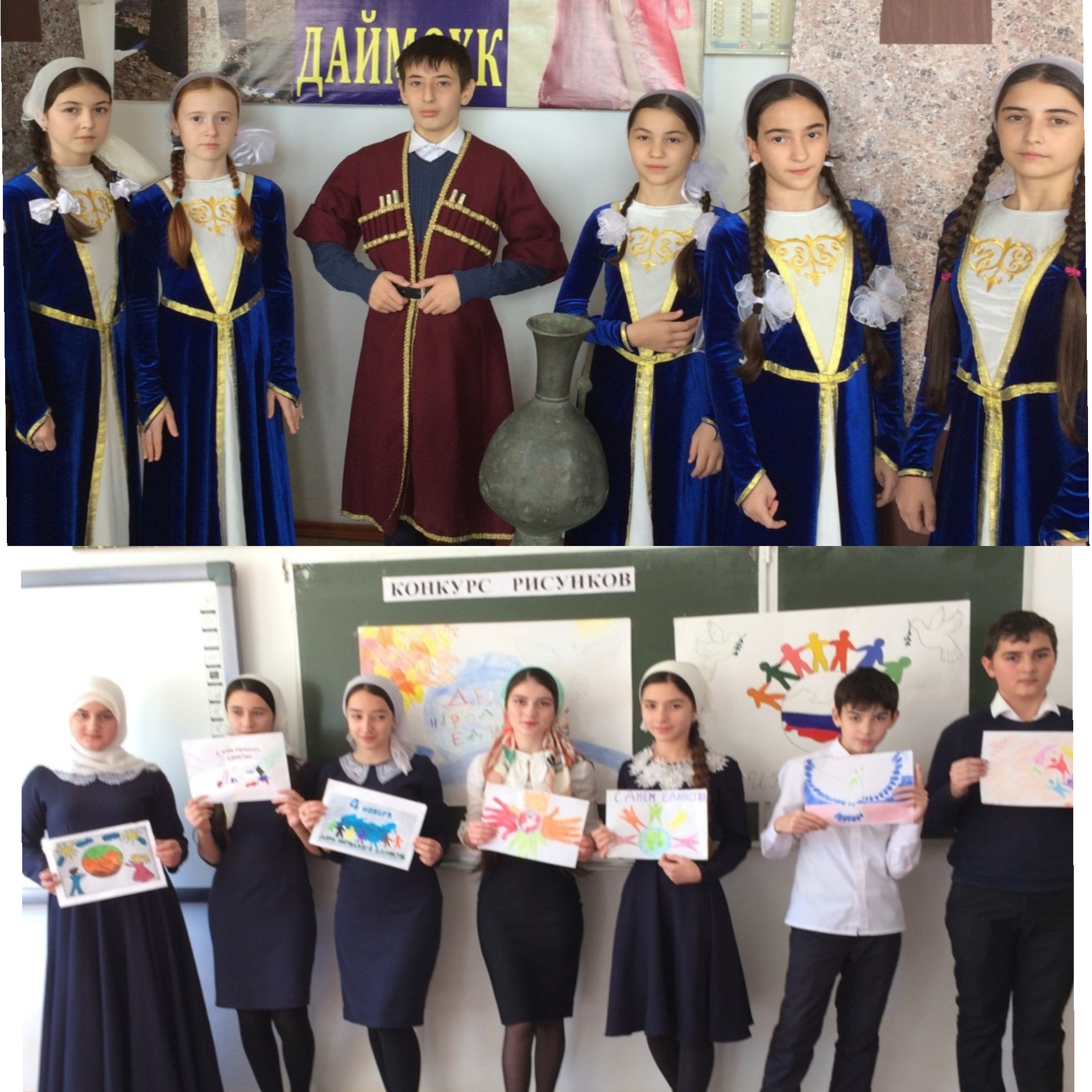 Среди обучающихся 6-8 классов проведен конкурс стихов о мире, о Родине. Участники конкурса были хорошо подготовлены. Лучшими чтецами были названы ученицы 8класса Куркаева А., Усаева А. Все мероприятия были красочно оформлены стендами, плакатами. На уроках истории в 5-6 классах (98 обуч-ся) учитель истории Хушаева З.М. показала видеофильм о роли Первого Президента Чеченской Республики, Героя России А.Х. Кадырова в возрождении Чеченской Республики. Хочется отметить литературно- музыкальную композицию «День гражданского согласия и единения», которую подготовили учащиеся 4 класса под руководством Автаева М.С-М. и утренник « Мир тебе, Чечня!» в 3 классе (учит. нач.кл. Ильясова Л.М.) . Здесь звучали песни о Родине, учащиеся выразительно читали стихи.