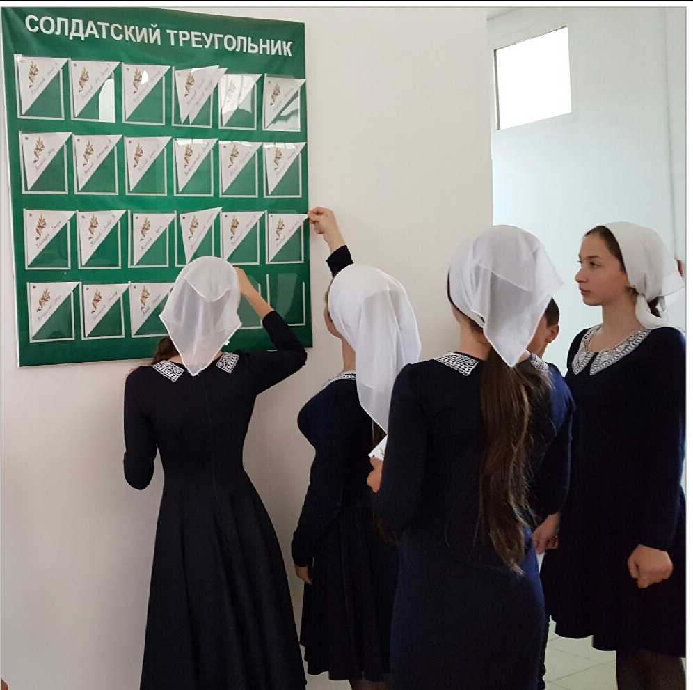Учащиеся нашей школы приняли активное участие в Республиканском проекте «Звезда Победы». Обучающиеся 10класса под руководством классного руководителя Килоевой С.С. участвовали в акции «Солдатский треугольник», главной задачей которой являлось увековечить имена земляков, воевавших на полях сражений Великой Отечественной войны, ковавших Победу в тылу. Солдатскими треугольниками оформлена «Стена Памяти», посвященная нашим односельчанам- участникам войны. Школьную «Стену памяти» пополняют сведения обучающихся об их родственниках –участникахВеликой Отечественной войны.