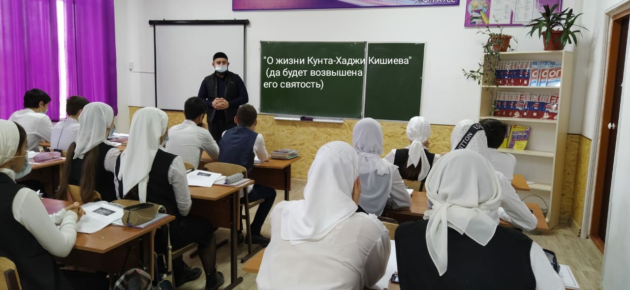В рамках реализации Единой концепции духовно-нравственного воспитания и развития подрастающего поколения Чеченской Республики, с целью повышения духовно-нравственного воспитания и обогащения детей знаниями о своей религии, согласно плану мероприятий, посвященных Дню почитания эвлия- устаза Кунта – Хаджи Кишиева, 11 января 2020 года педагогом –организатором ДНВиР Исаевым Р.Х. проведена беседа «Нравственно – религиозное учение суфия Кунта – Хаджи Кишиева да будет возвышена его святость) ». с обучающимися 9 класса.