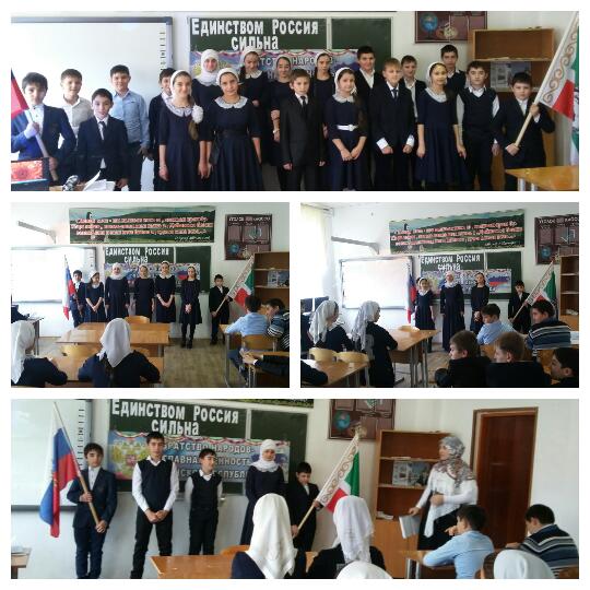 Классный час «Единством Россия сильна» был подготовлен учащимися 7класса под руководством Мерзуевой М.А. Классный руководитель использовала исторические сведения о событиях 1612 года, в память которого установлен этот праздник, а учащиеся читали стихотворения о мире, дружбе и согласии.