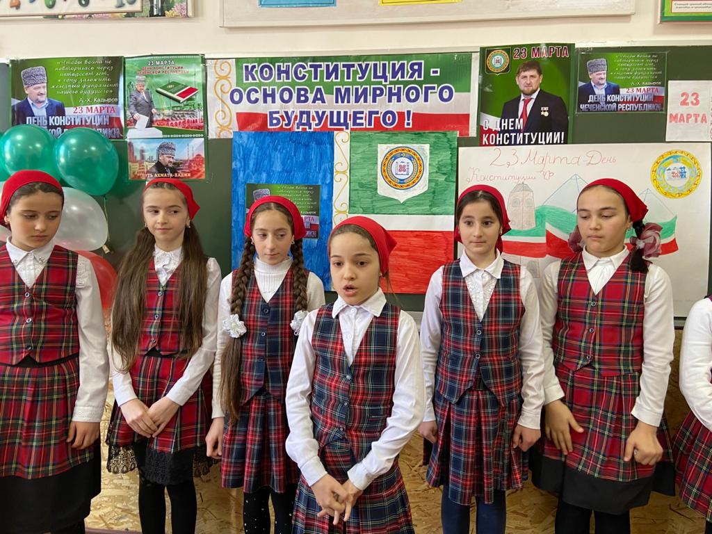 В своей вступительной беседе классный руководитель рассказала учащимся об истории принятия Конституции Чеченской Республики на референдуме 23 марта 2003 года и роли первого Президента ЧР, Героя России Ахмата-Хаджи Кадырова в этом значимом для всей республики событии. Затем учащиеся выступили с литературной композицией: читали стихи, исполняли песни о Родине.