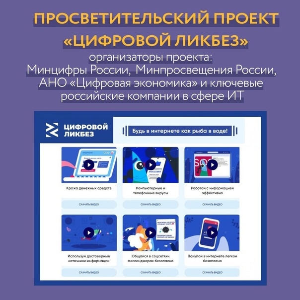 07.06.2022В преддверии Международного дня защиты детей стартовал проект «Цифровой ликбез», созданный АНО «Цифровая экономика» при поддержке Минпросвещения России. Пресс-служба Минпросвещения России Он объединяет серию просветительских мультипликационных роликов, которые на понятных примерах учат детей азам цифровой грамотности и кибербезопасности. Контент верифицирован Минпросвещения России, рассчитан на возрастную категорию 6+ и рекомендован для просмотра с родителями и педагогами. «Наша задача – помочь подрастающему поколению и привить им азы цифровой грамотности. Просветительский проект «Цифровой ликбез» призван повысить общий уровень информационной безопасности ребят, научить их правильному поведению в интернет-пространстве. Это соответствует целям нацпрограммы «Цифровая экономика» по повышению навыков цифровой грамотности среди населения», – подчеркнул вице-премьер Правительства РФ Дмитрий Чернышенко. Заместитель Министра просвещения Татьяна Васильева напомнила, что навыки цифровой грамотности стали одними из самых необходимых для людей всех возрастов. «Проект «Цифровой ликбез» призван помочь детям освоить основные принципы безопасного пользования интернетом: как общаться в социальных сетях, каких ссылок стоит опасаться, где искать точную и проверенную информацию. Уверена, многие материалы проекта будут полезны и для родителей, и для старшего поколения», – отметила Татьяна Васильева. Видеоконтент проекта можно интегрировать и в образовательный процесс и использовать на уроках ОБЖ и информатики, а также при проведении классных часов и родительских собраний.
