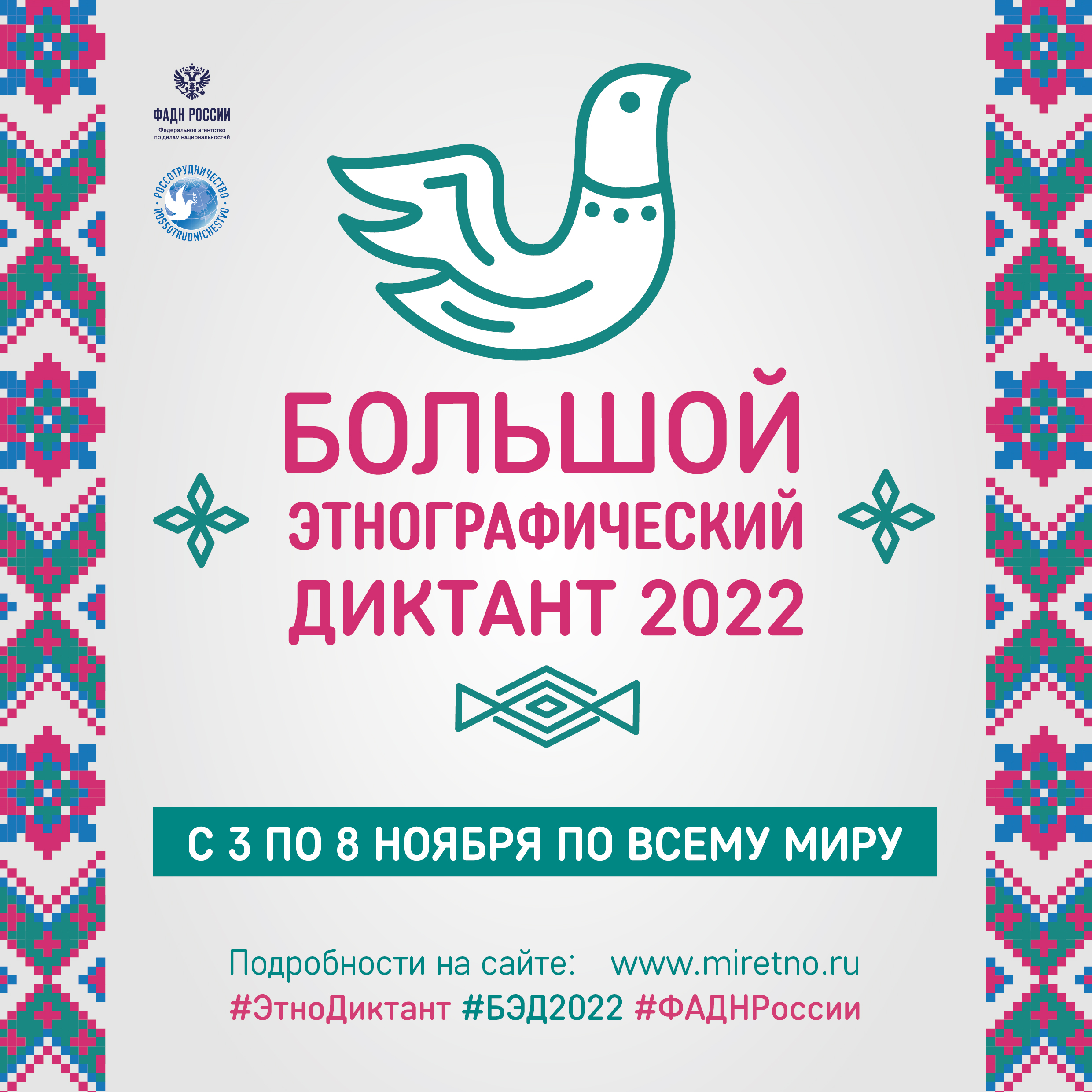 Большой этнографический диктант — это просветительский проект, который знакомит с культурой народов, проживающих в России, а также позволяет оценить общий уровень этнокультурной грамотности.Диктант проводится в период с 3 по 8 ноября 2022 г. в офлайн-формате на региональных площадках и онлайн-формате на сайте miretno.ru.
