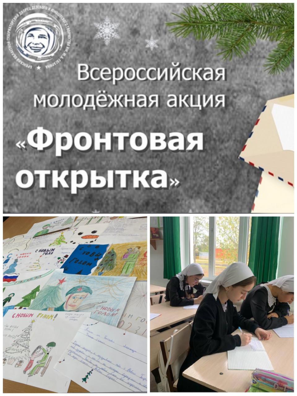 07.12.202206 декабря 2022 года под руководством заместителя директора по ВР Калаевой З.Ж. совместно с педагогом-организатором Уразбиевой М.А. с обуч-ся 6 класса приняли участие во Всероссийской молодежной акции «Фронтовая открытка». Цель акции: поддержать участников военной операции, а также мобилизованным военнослужащим , проходящим подготовку и боевое слаживание.