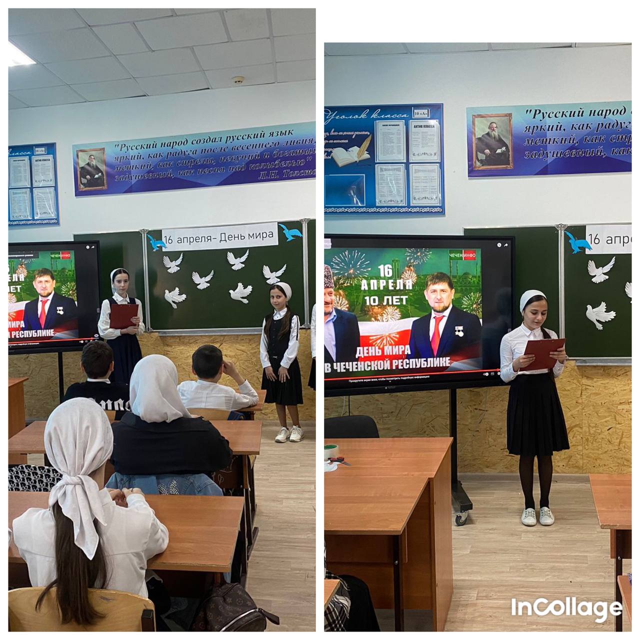 15.04.202315.04.2023г. Классный руководитель Матагова М.А. с обуч-ся 6 класса провела классный час «16 апреля -День мира» Цель: вспомнить страницы истории ЧР, подчеркнуть роль главы Республики в восстановлении разрушенных городов и сел, воспитывать патриотизм.