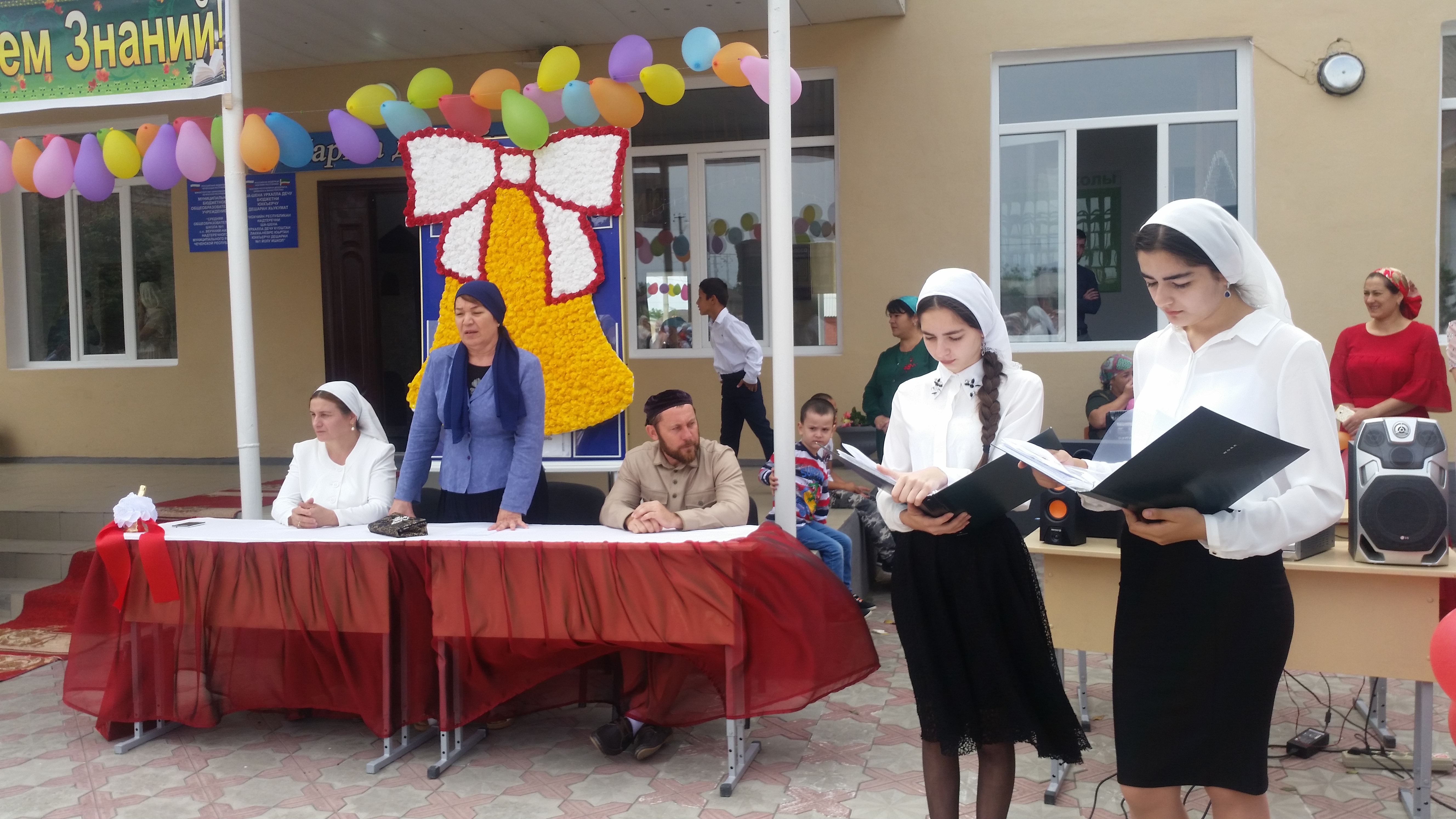 На торжественной линейке присутствовали гости: представитель РУО Гайраханова З.С., представитель духовенства с. п. Верхний- Наур Джабаров М.Т., родители.