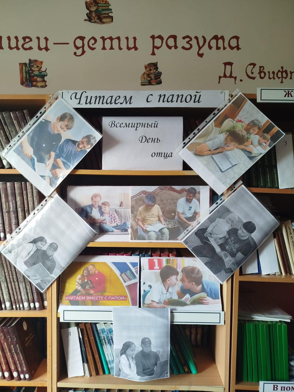 В библиотеке МБОУ "СОШ №1с.п.Верхний-Наур" к Всемирному Дню отца оформлена выставка фотографий детей, читающих со своими папами. Выставка оформлена 16.10.2025..