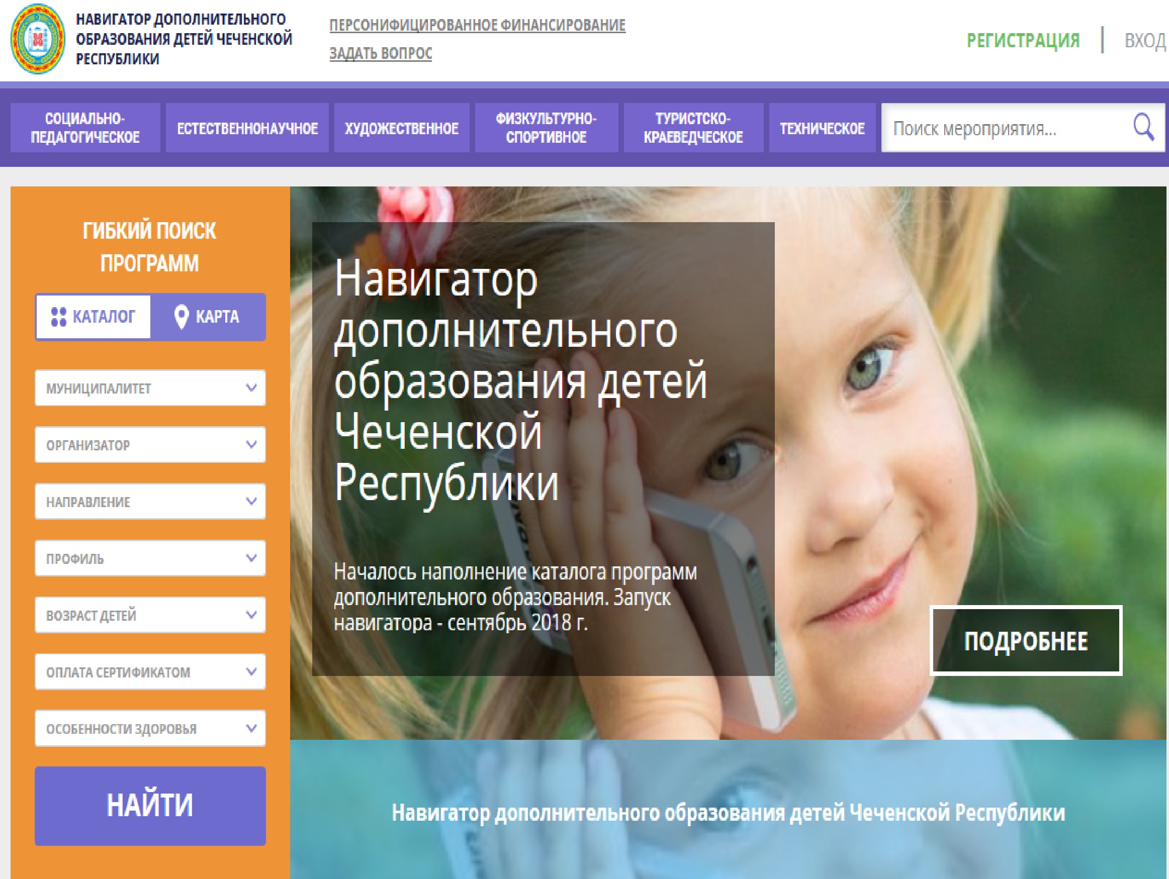 Навигатор дополнительного образования детей Чеченской Республики: стартуем 20 августа В Чеченской Республике начинает работу сайт-навигатор по дополнительным общеобразовательным программам для школьников. Навигатор дополнительного образования – это единая база кружков, секций, объединений различной направленности для детей всех возрастов. Каждый сможет найти занятие по душе, исходя из собственных предпочтений, пожеланий и способностей. Портал создан на технологиях Inlearno, в рамках приоритетного проекта «Доступное дополнительное образование для детей». Присоединяйтесь к Навигатору и давайте вместе помогать нашим детям в сложном выборе правильного жизненного пути.