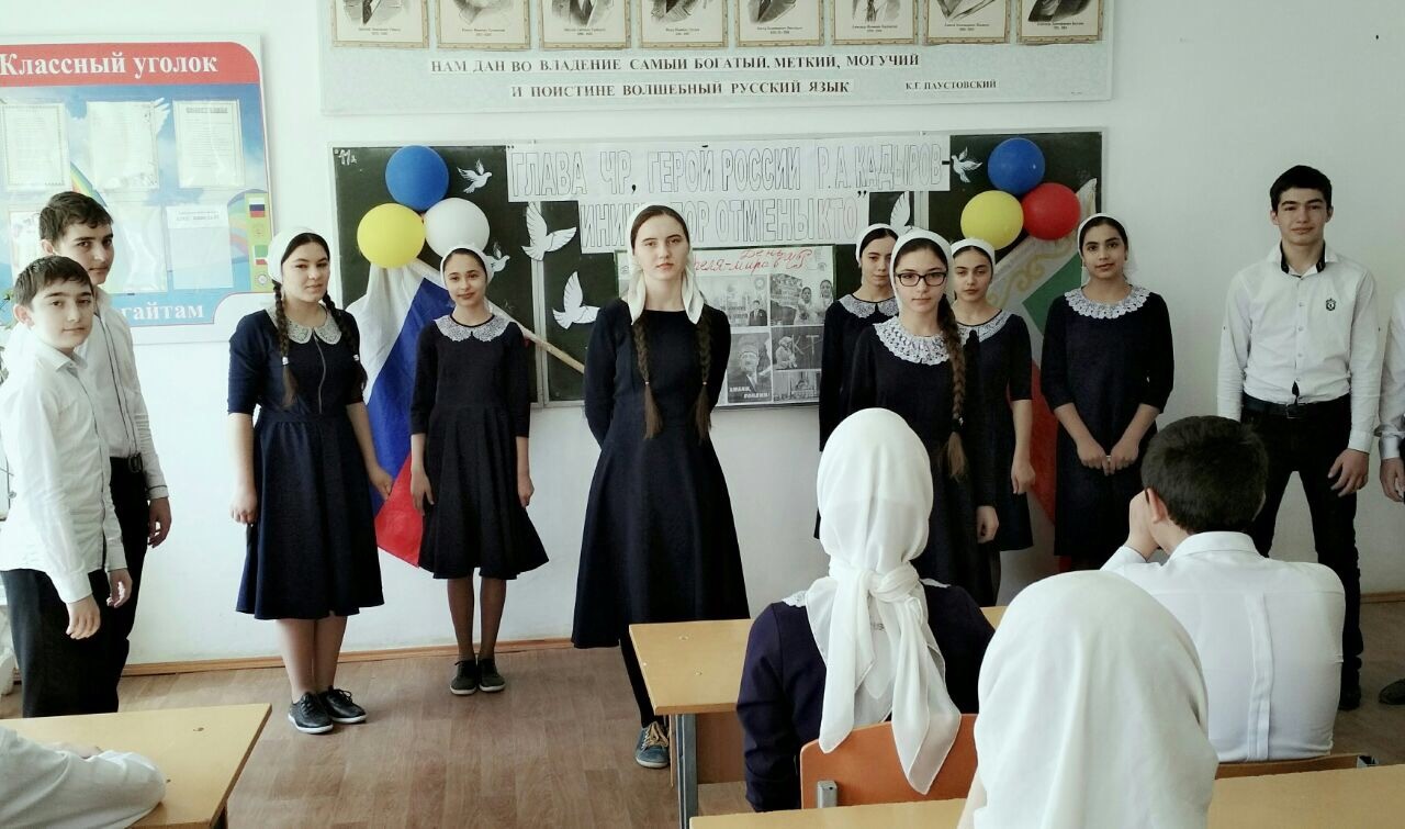 Классный час «Глава ЧР, Герой России Р.А.Кадыров –инициатор отмены КТО» был подготовлен обучающимися 8 классов. Организаторы мероприятия - классные руководители Матагова М.А., Мерзуева М.А. На мероприятии присутствовали директор школы Джанхотова М.Ш., учителя, учащиеся. В своем вступительном слове директор школы Джанхотова М.Ш. сказала: «Дата отмены режима контртеррористической операции в Чеченской Республике стал праздничным днем и будет отмечаться ежегодно. Об этом заявил Президент ЧР Рамзан Кадыров. Приказ о введении режима КТО в Чечне, действовавший на протяжении почти 10 лет, был отменен директором ФСБ Александром Бортниковым по поручению президента РФ Дмитрия Медведева 16 апреля 2009 года. С этого дня начался отсчет новой истории нашей республики. Мы доказали всему миру, что способны защитить Россию, отстоять свою культуру, свои традиции».