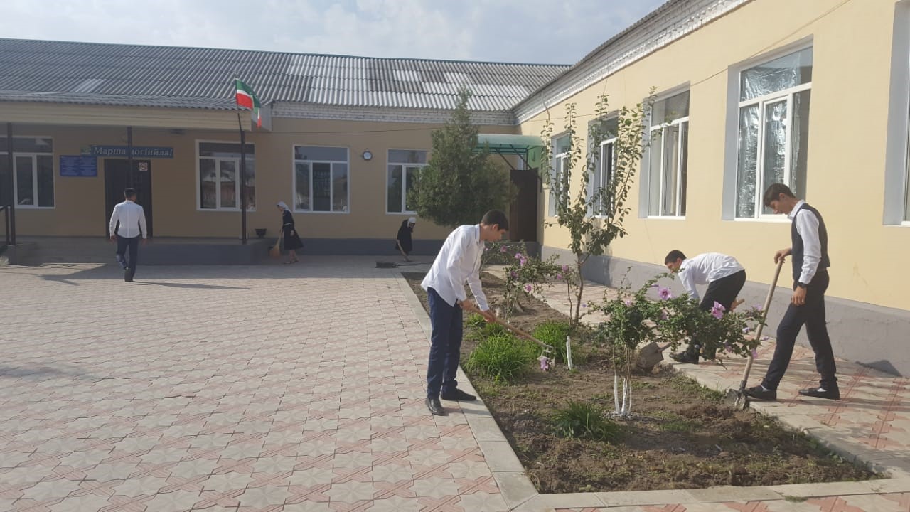 В ходе уборки территории пришкольного участка и прилегающей к ней территории от мусора, учащиеся 9-11 классов с классными руководителями Нунаевой М.И, Бисултановой Л.И., работали на газонах около школы: очистили клумбы, рассадили цветы , разрыхлили землю.