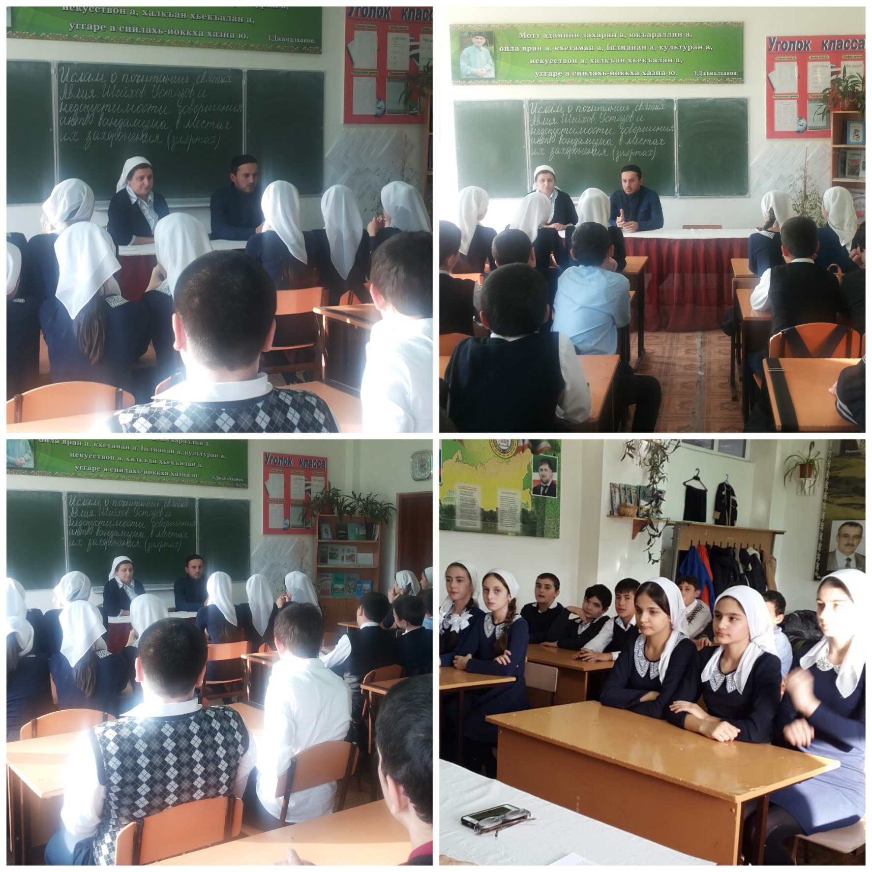 10.11.2015В МБОУ «СОШ №1 с.п. Верхний Наур» 19 ноября прошли мероприятия по факту поджога священного места - Зиярата Янгульби-Хаджи в селе Курчалой. На мероприятиях присутствовали директор школы Джанхотова М.Ш., зам. директора по ВР Анзорова М.С., педагог по ДНВиР Исаев Р.Х. Педагог по ДНВиР Исаев Р.Х. , а также классные руководители в своих классах, рассказали обучающимся, как высоко почитали наши предки святых и то наследие , которое они оставили нам. Директор школы Джанхотова М.Ш. в своем выступлении сказала : «Сегодня сердца наших сограждан полны негодованием, потому что этот вопиющий акт вандализма – оскорбление чувств каждого верующего. Этот кощунственный поступок осудили все: и взрослые, и дети».